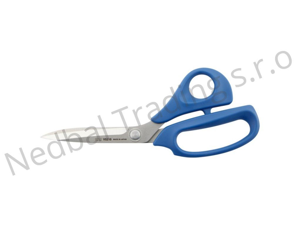 Modré krejčovské nůžky KAI V5210B mají zvětšený vnitřní prostor pro čtyři prsty a  ergonomické vybrání pro položení ukazováčku zaručující pevnější držení nůžek....